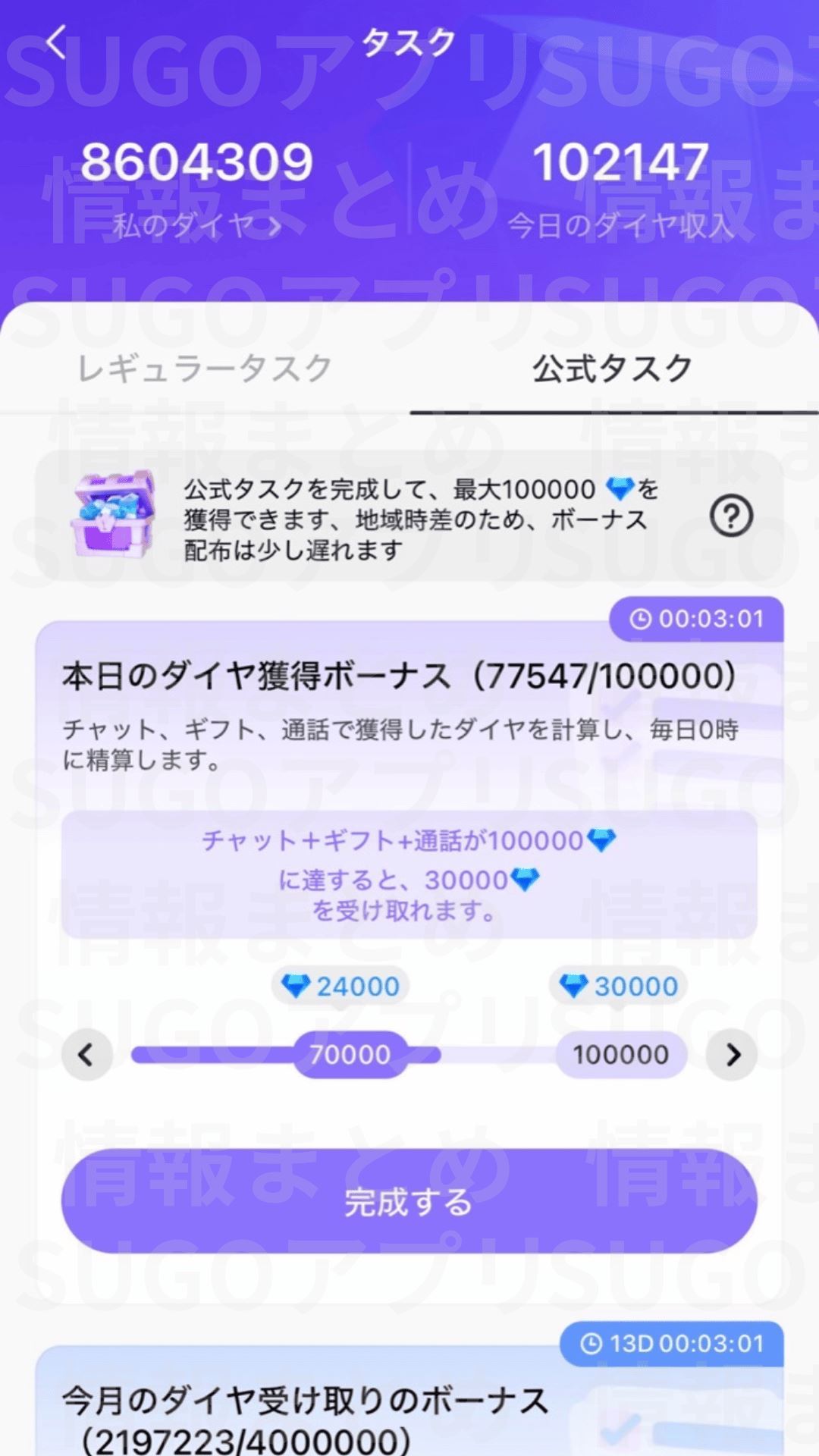 SUGOでは、チャット・ギフト・通話などでダイヤを獲得していくと、追加でボーナス報酬がもらえる「公式タスク」があります。